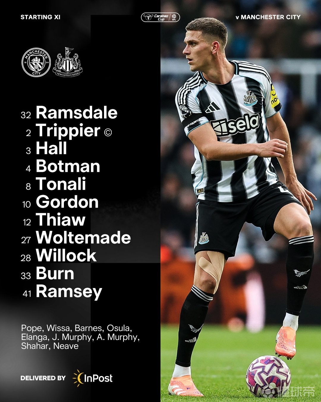 纽卡首发:32-拉姆斯代尔、3-霍尔、12-佳夫、4-博特曼、33-丹-伯恩、2-特里皮尔、41-雅各布-拉姆齐、8-托纳利、28-威洛克、10-安东尼-戈登、27-沃尔特马德